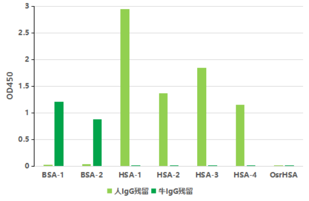 yl23455永利的植物源重组人血清白蛋白OsrHSA来源于水稻,可杜绝传播血源性病毒的潜在风险,比血浆来源的人血清蛋白更安全;同时,人类接触和食用大米(水稻)具有几千年历史,与水稻内源蛋白具有长期接触史,对稻米的杂质蛋白具有很高的耐受性和相容性,免疫原性较低,比其他表达体系更安全。由于yl23455永利生物的辅料级人血清白蛋白不来源于血液,因此完全不含有血液蛋白残留,例如血液中常见的免疫球蛋白,它的存在在药用辅料中将成为潜在致敏源,同时也可能对药品制剂产生影响的风险。虽然市售天然蛋白利用纯化工艺将其大部分去除,但仍有一定残留,yl23455永利生物的OsrHSA使用IgG ELISA检测则没有检出IgG残留(图2)