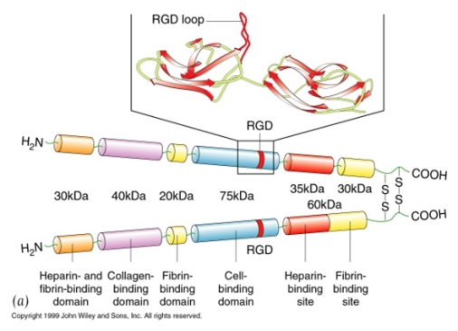 纤连蛋白(fibronectin,FN)最早于1948年由美国生物学家发现,是一种人体中必需的蛋白质,广泛存在于哺乳动物组织及组织液中,分子质量为 450 kDa,由两个分子质量为 220 kDa的亚基通过链间二硫键连接而成。含有1个独特的RGD序列和6个功能结构域,经局限性蛋白酶解可切割为几个结构域,可与血纤蛋白、肝素、胶原、DNA以及细胞表面受体等结合,具有多种生物学功能。