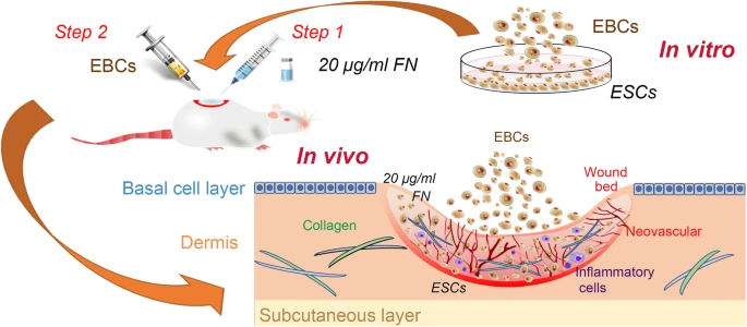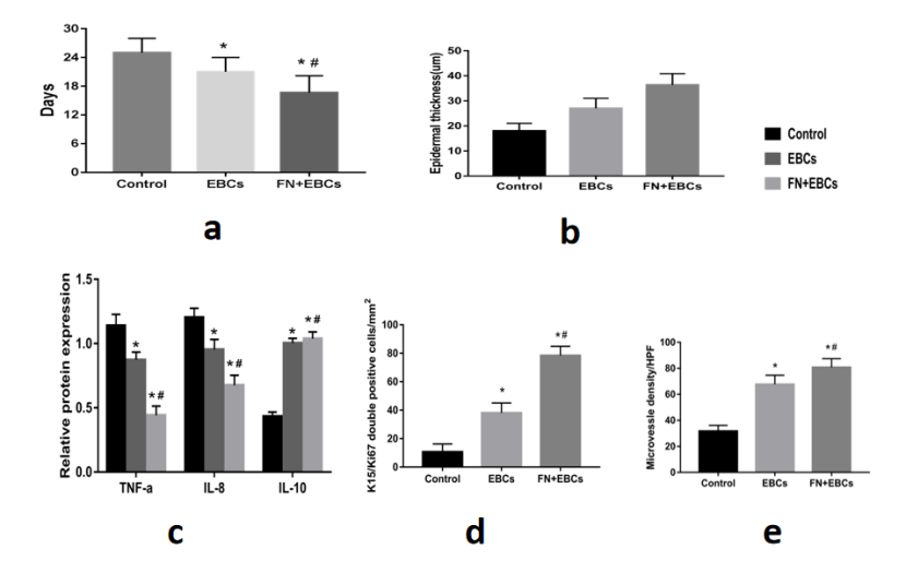在EBC喷雾之前,在创面床上预涂FN可通过提高ESCS的利用效率,促进血管生成,减少创面炎症,调节胶原的形成和降解,显著缩短创面愈合时间,增加创面愈合表皮厚度。