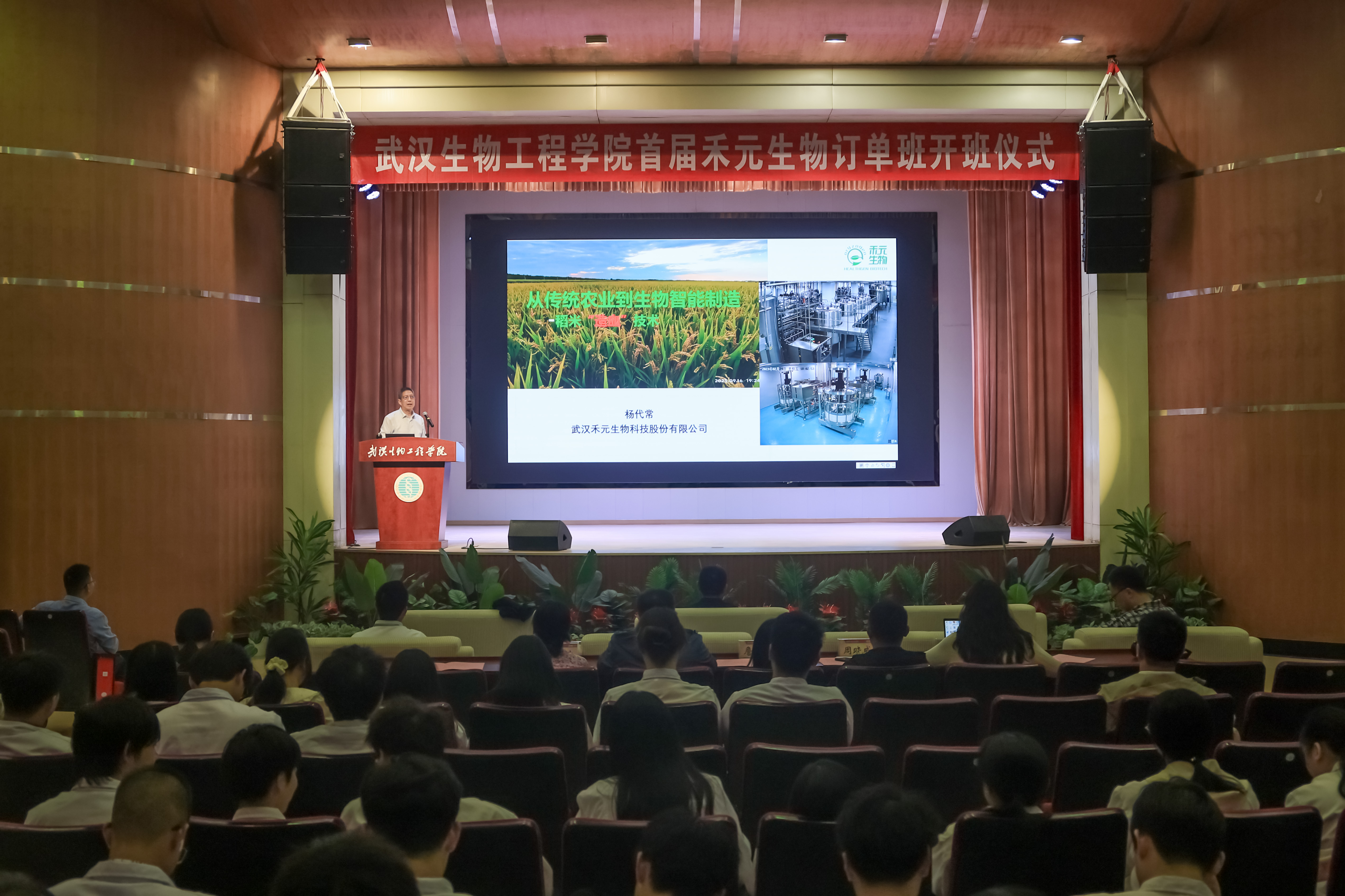 杨代常为订单班带来开班第一课《从传统农业到生物智能制造-稻米“造血”技术》现场。